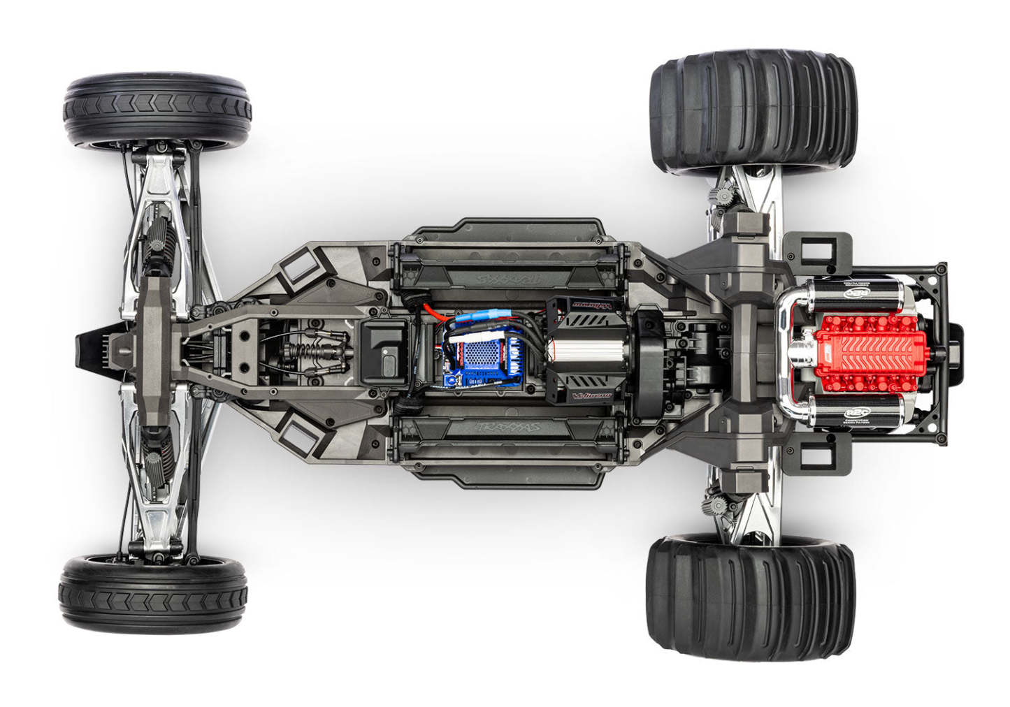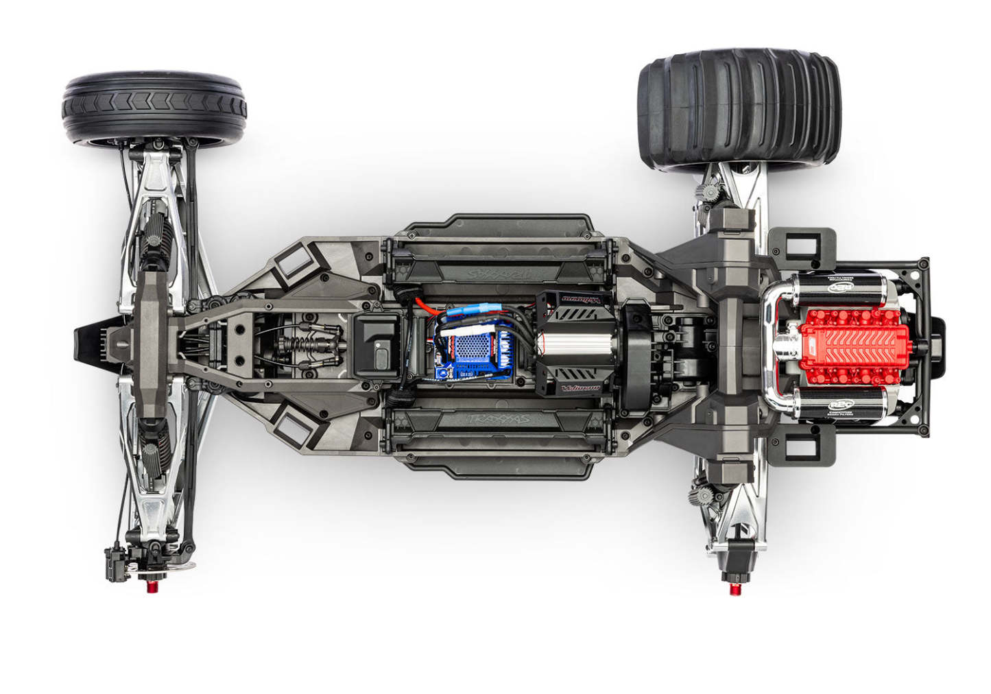 Powerful front disc brakes work in tandem with the rear motor braking for powerful and controlled 4-wheel stopping power. Sheathed cables clamp the calipers down on drilled stainless steel rotors for scale authenticity. A digital 2075 servo actuates the brakes through an adjustable linkage for greater braking precision and control.