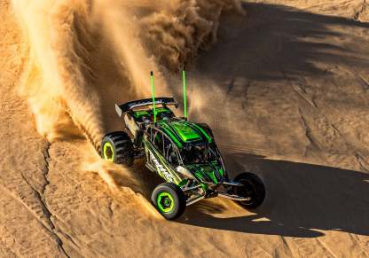 Traxxas pulled out all the stops to replicate the full-size Funco GTU Sand Car in exact detail. The Pro Scale Sand Car features a full interior with dashboard and driver figures and replica remote-reservoir 3.5″ shocks. The engine is a work of art, comprised of 9 different pieces, including licensed R2C air filters and a Whipple supercharger.