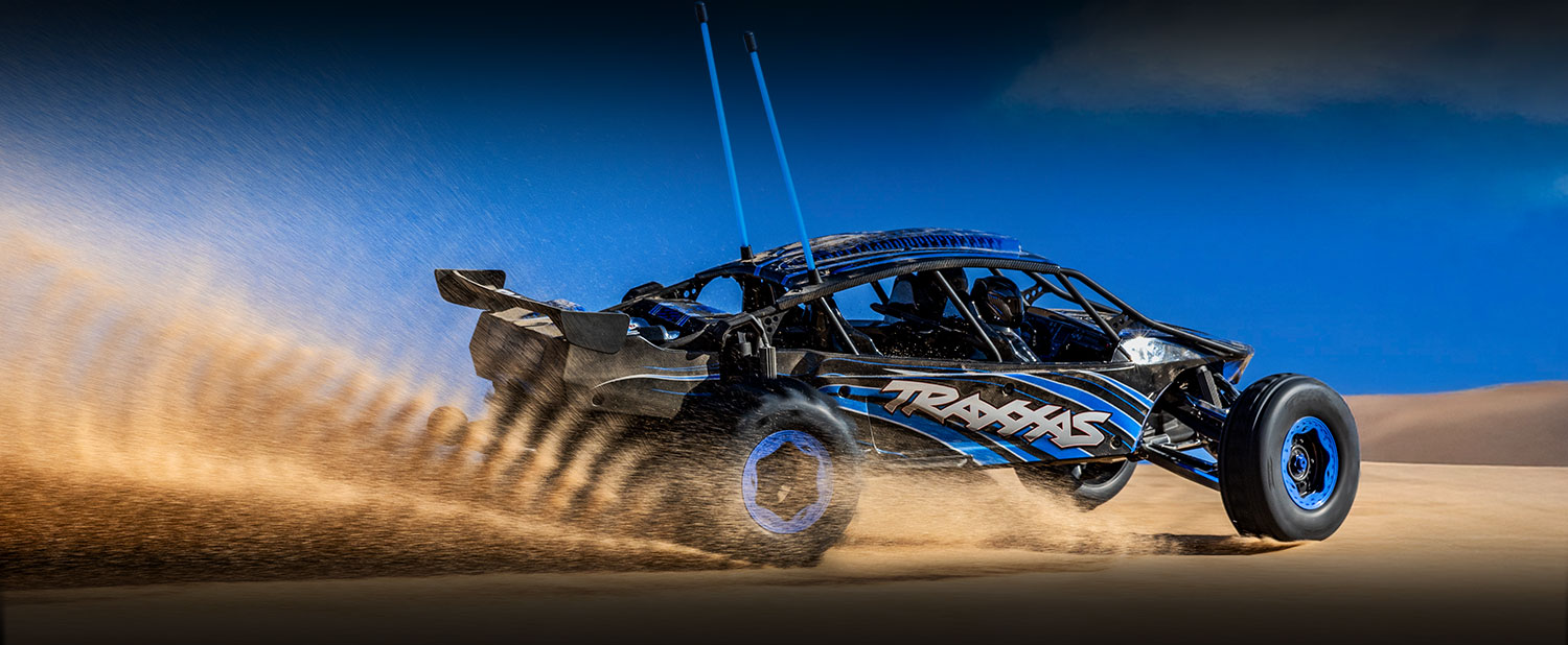 Driving a sand car is an adrenaline-fueled thrill ride like nothing else on Earth. Outfitted with 1000+ horsepower engines and trick long-travel suspension systems, sand cars can top 150 mph and wheelie with just a blip of the throttle. The new Traxxas Pro Scale® Sand Car is a 55+ mph replica purpose-built to deliver the same raw excitement and thrill of driving the full-size Funco Motorsports car in dramatic X-Series™ scale.