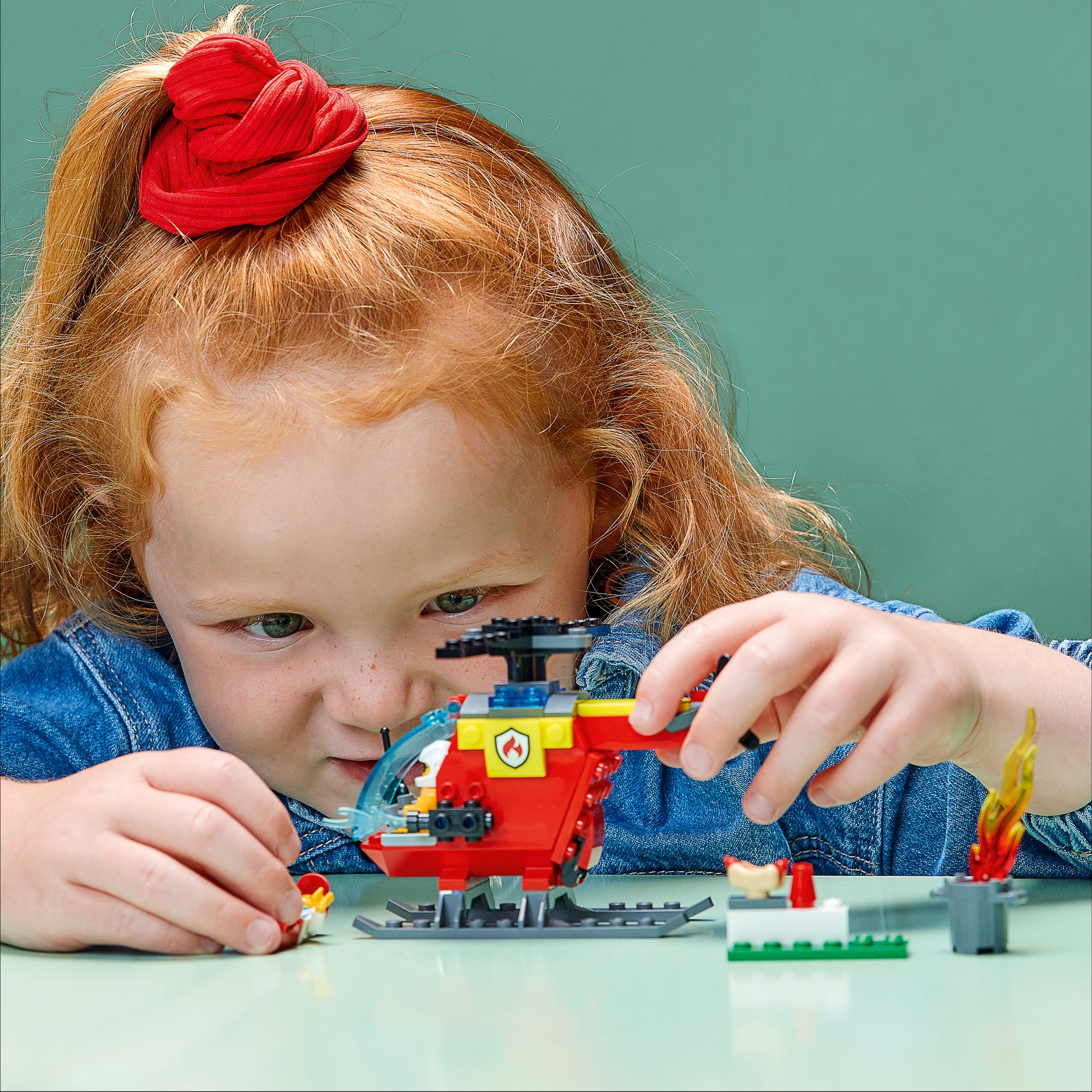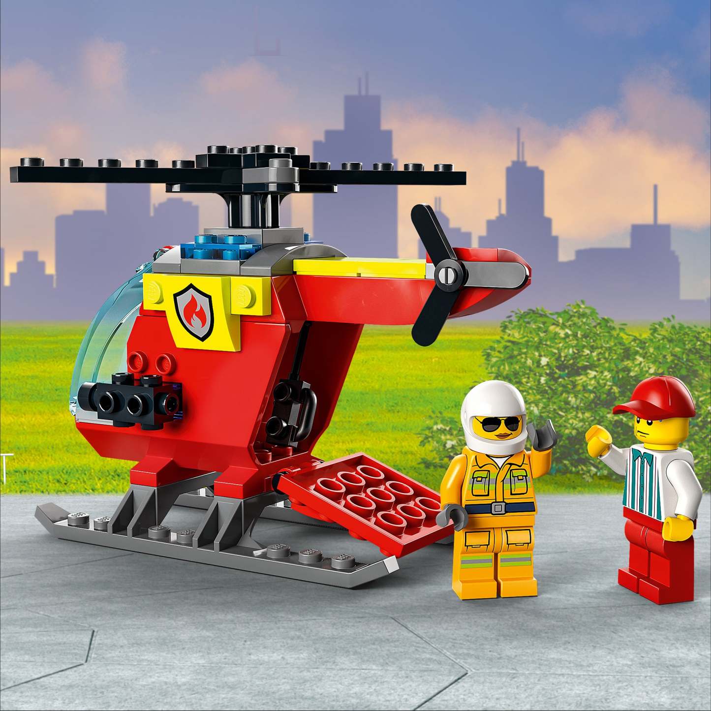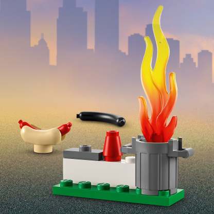 - What’s in the box? – Everything you need to build a toy fire helicopter, plus firefighter and vendor minifigures, a trash can with LEGO® flames and fun accessories, including a burnt hotdog