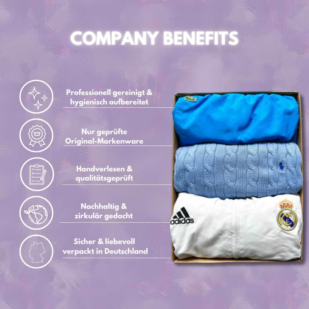 In unserer Beliebtesten Mystery Box befinden sich 3 / 5 Premium Vintage Pieces von Marken wie: Nike, Adidas, Lacoste, Ralph Lauren, Stüssy, Carhartt etc.
