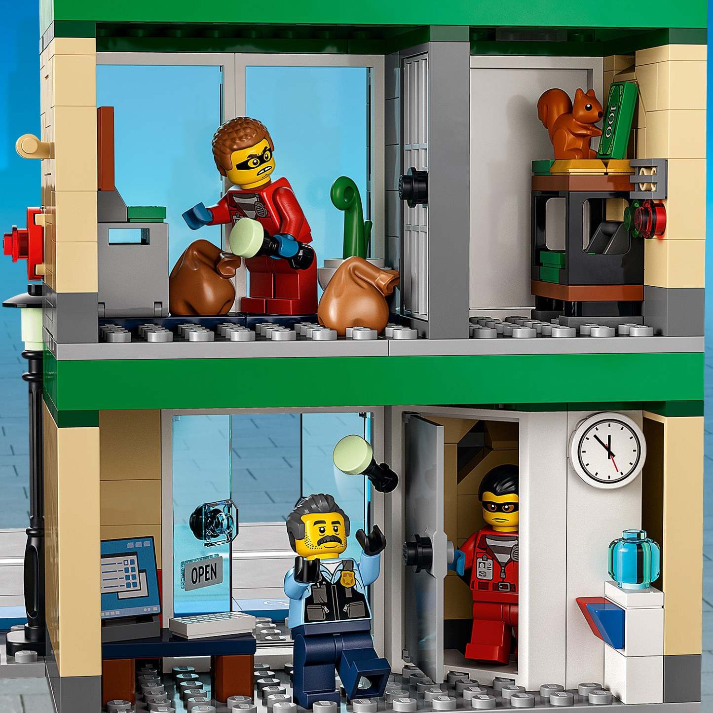 - What’s in the box? – Everything kids need to build a multifunctional bank building, crooks’ heist truck, police helicopter and police truck, plus 6 minifigures, including 5 LEGO® City TV characters
